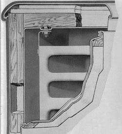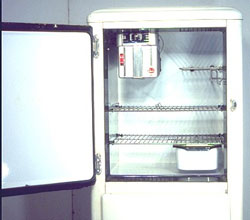Notice that the evaporator was also similar in size and shape to an automobile battery. Some early cooling units incorporated a hollow jacket containing a brine solution. The brine solution was cooled by the evaporator and continued to absorb heat, even when the refrigerator was not running. Thus, the capacity to cool was maintained, or ‘stored’, much as the advertisement claimed.