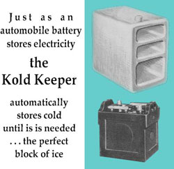 While heat can be stored, cold is just an absence of heat. The concept of storing cold is not consistent with the theory of heat. But it was a popular notion, and the advertisers took advantage of this. The idea of storing electrical power in a lead-acid battery had become familiar with the more widespread use of automobiles. In the popular mind, a block of ice ‘stored’ winter’s cold until it was needed on a hot summer day. So, the refrigerator’s cooling unit, or freezer, was promoted as storing cold like an automobile battery stores electricity, like a block of ice stores cold.